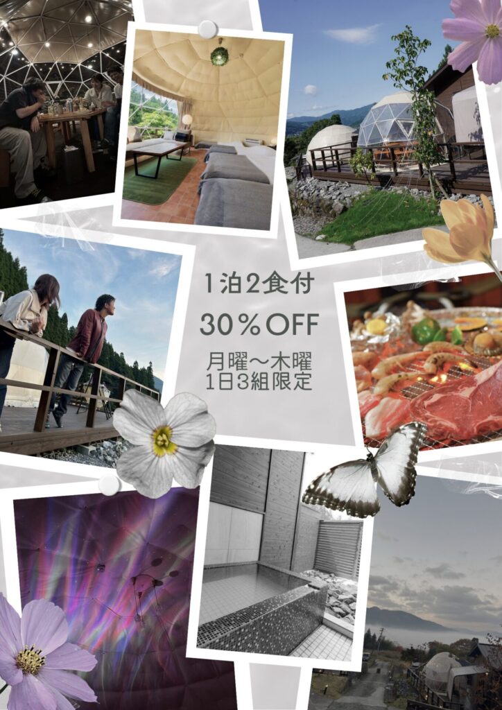 大自然に囲まれた秘境の地で、源泉かけ流しのプライベート温泉に癒され、ステーキBBQを楽しみ、ドームテントでおくつろぎいただけます。