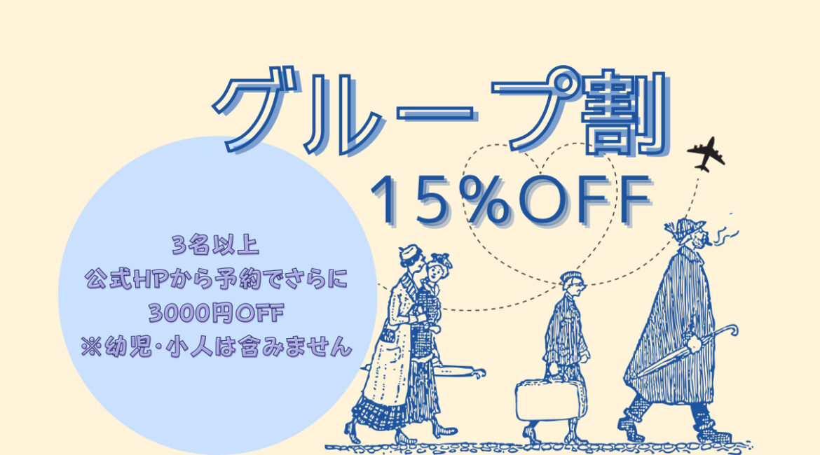 お得な「グループ割引」のご案内! 大人3名様~ご予約可能! 自然の中で、大切な仲間たちと思い出に残る...